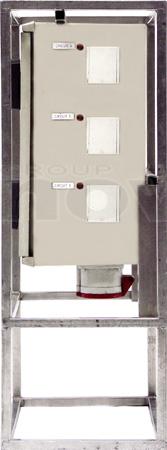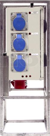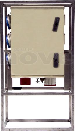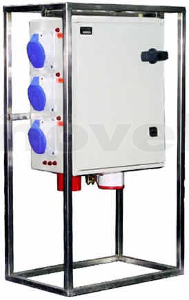 Armoire de distribution sur pied. Entrée : P17 32A tri. Sorties : 3 x P17 32mono + 3 x PC16A. Protection différentielle 30mA
