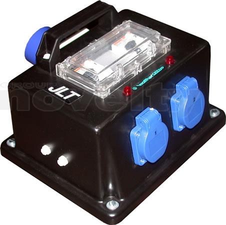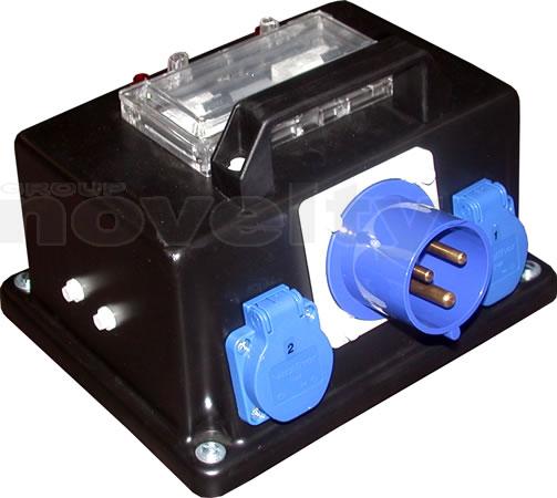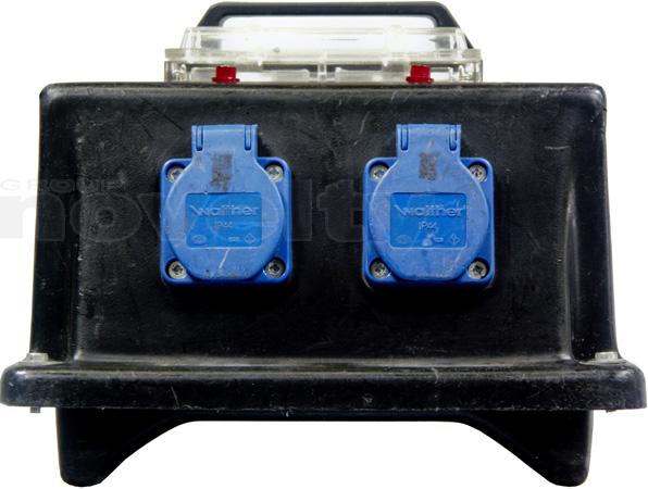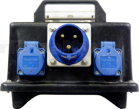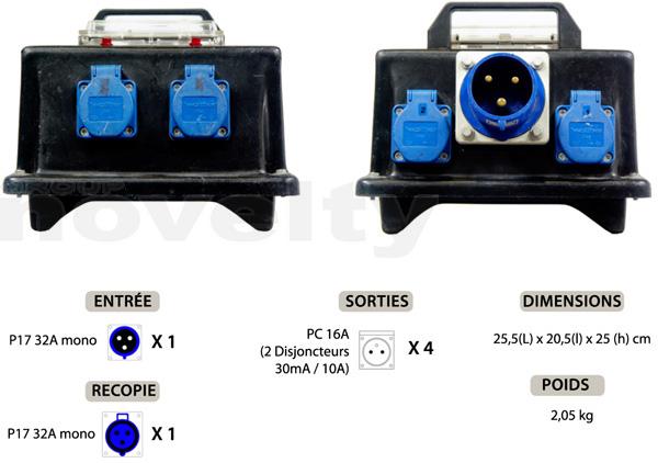 Boitier de distribution. Entrée : P17 32A mono. Sorties : 4 x PC16A. Protection différentielle 30mA.