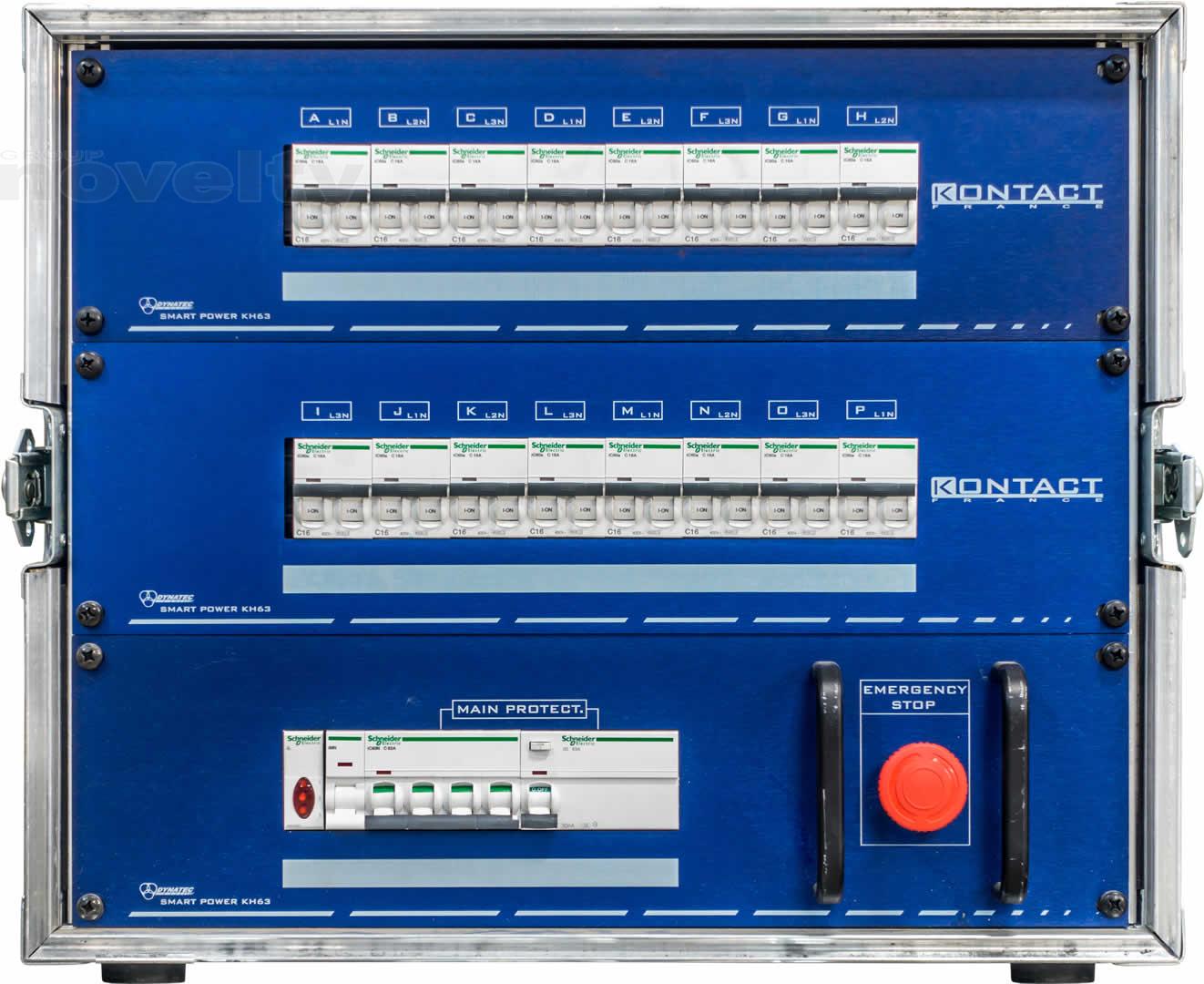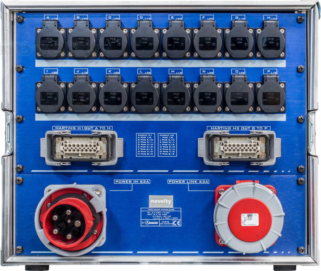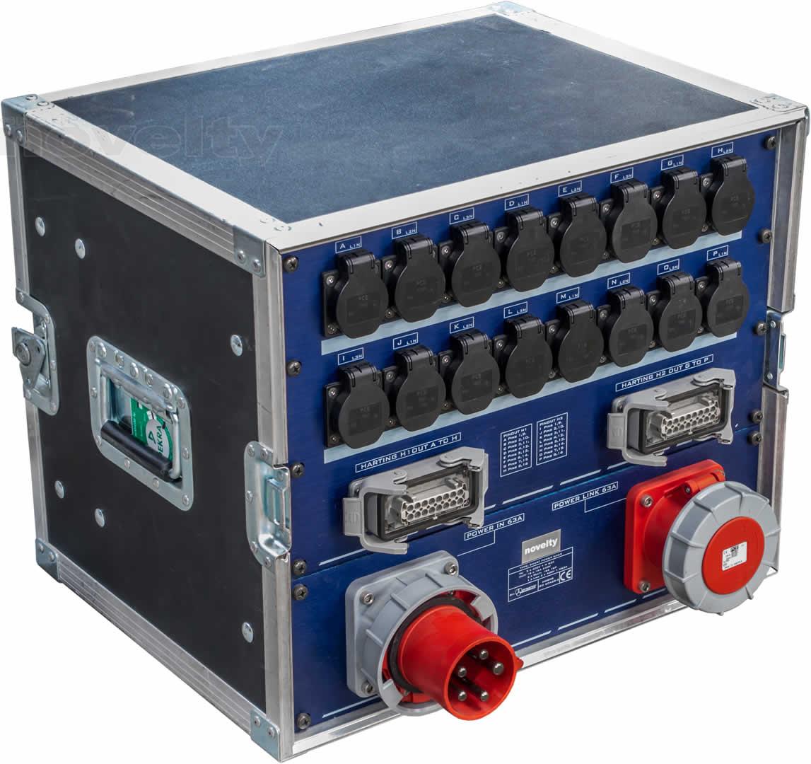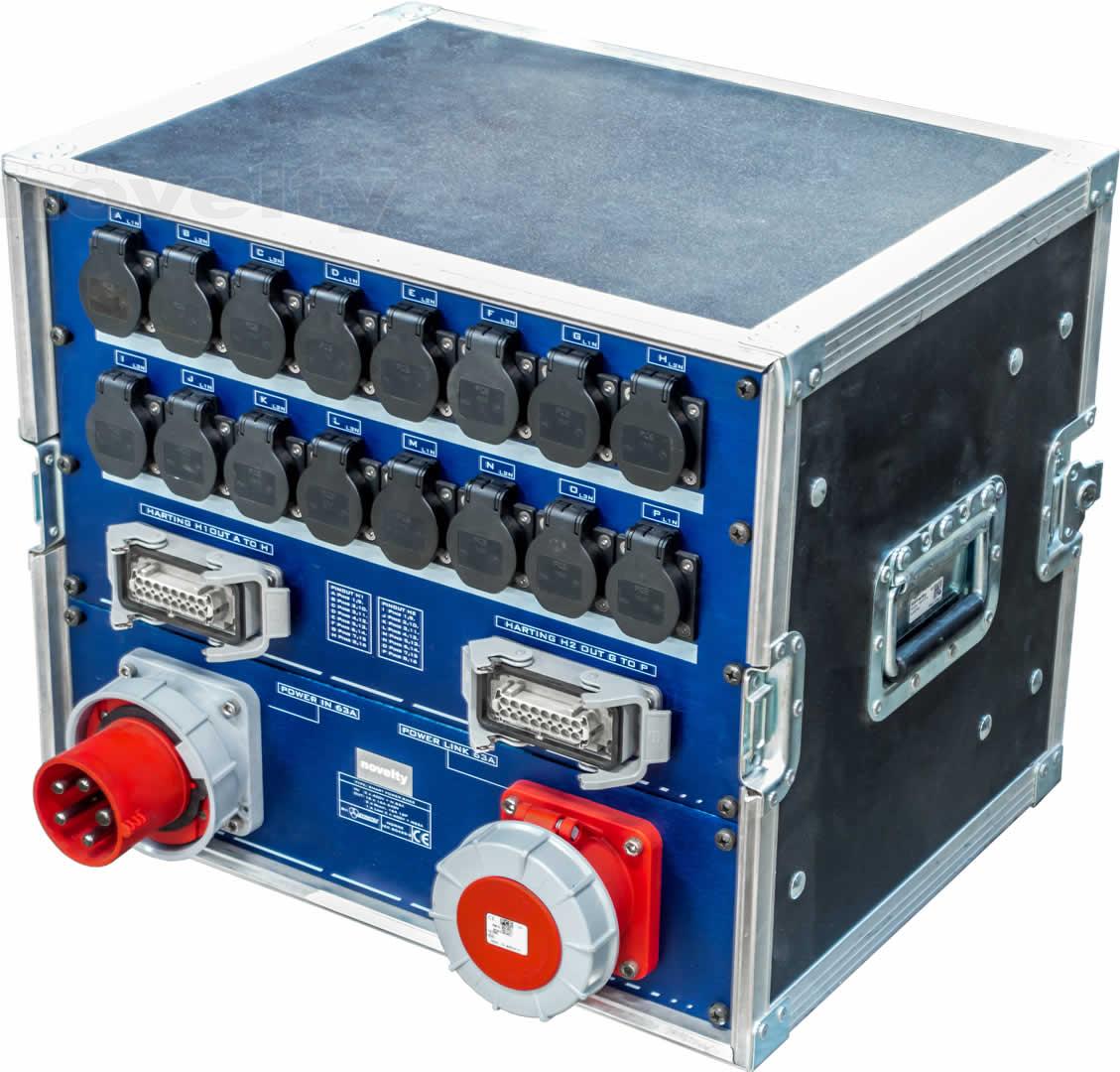 Armoire de distribution. Entrée P17 63A tri. Sortie : 16 x PC16A + 2 Harting 8 circuits + 1 recopie 63A tri. Protection différentielle 30mA.