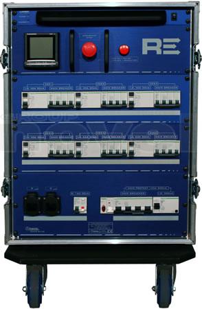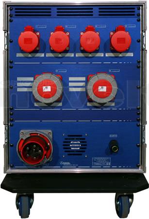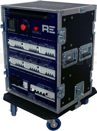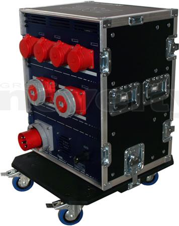 Armoire de distribution en flight-case. IN = P17 125tri / OUT = 2 x P17 63A + 4 P17 32A + 2 x PC16A. Protection différentielle 30mA