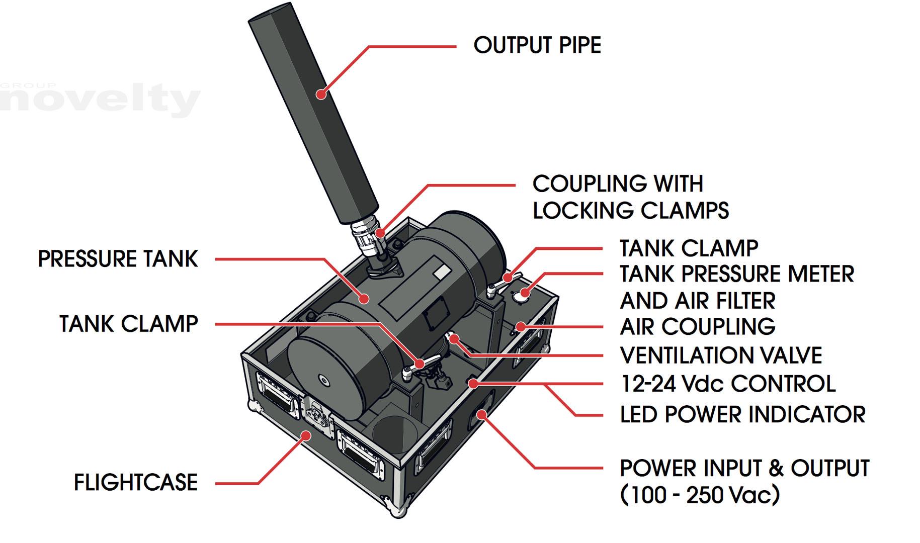 Le déclenchement du tir s'effectue par impulsion 230V/50Hz à partir d'un simple dispatch lumière, un bloc de puissance DMX 512 ou une prise radiocommandée pour les plus simples utilisations.