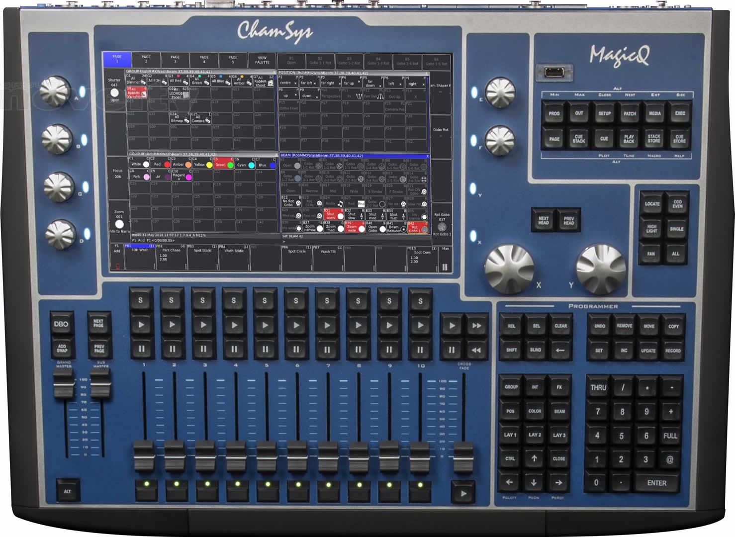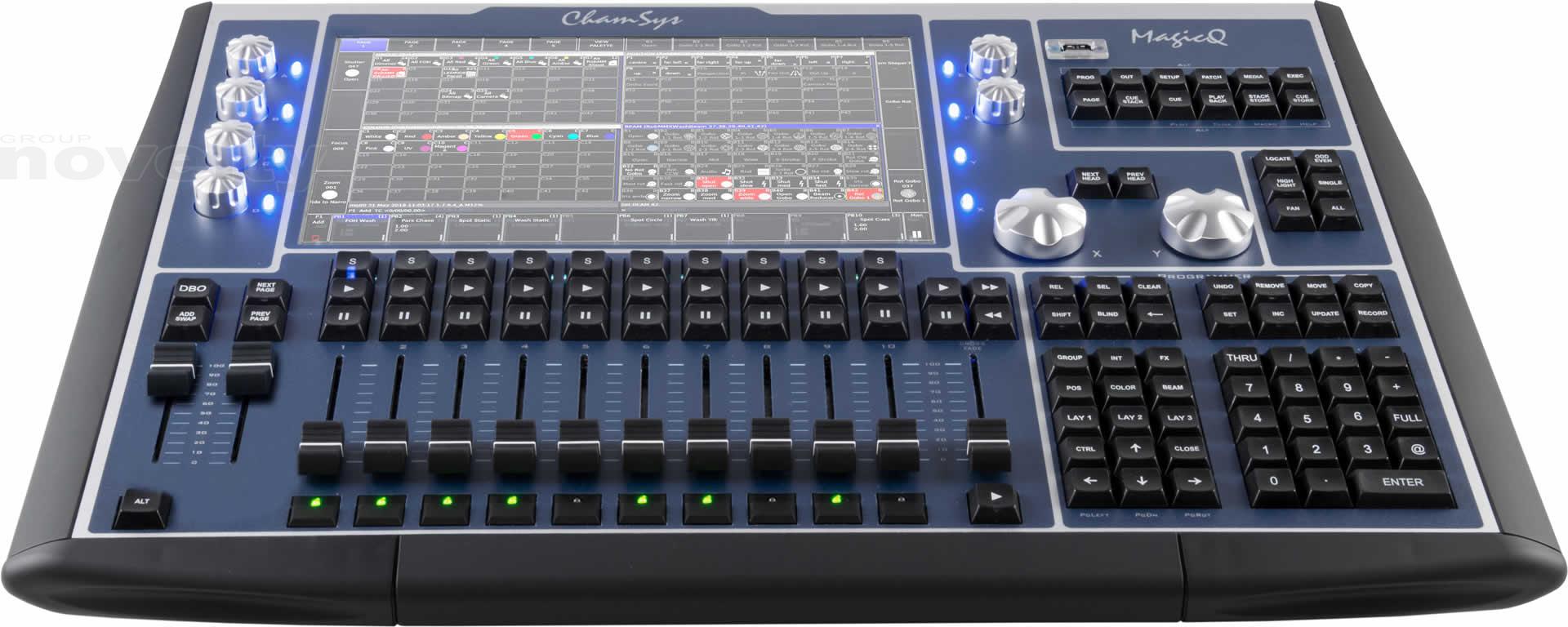 Il dispose d'un grand écran tactile central de 12 pouces qui permet d'accéder facilement à toutes les fonctionnalités de MagicQ. L'affichage haute résolution peut afficher des écrans tels qu'une fenêtre de tracé où les appareils peuvent être sélectionnés et mis au point graphiquement.