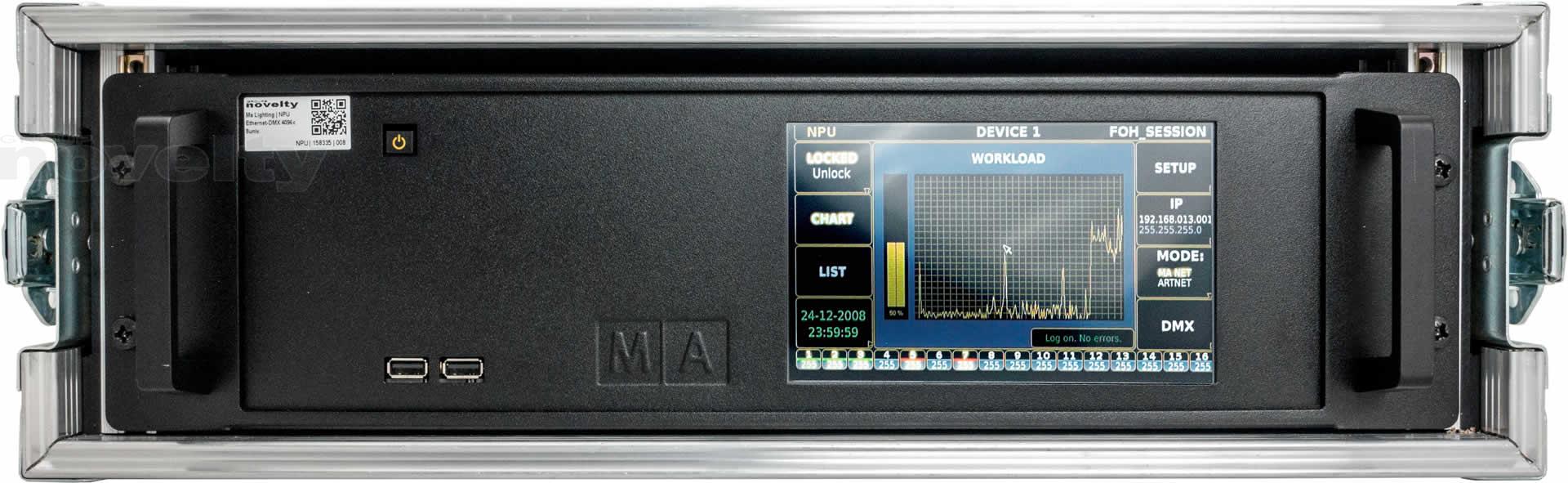 Le mA NPU (unité de traitement de réseau) est le lien entre l'Ethernet et les dispositifs commandés par DMX. Il est également possible d'employer le mA NPU pour des applications additionnelles de commande ; ses pleines possibilités deviennent évidentes une fois fonctionnées dans le MA-Net2. Pour les réseaux décentralisés de DMX, le mA NPU convertit les données entrantes d'Ethernet en données de DMX512-A. La conversion de données soutient le MA-Filet et le MA-Net2. Les données converties sont transmises par l'intermédiaire de 8 connecteurs indépendants de DMX, qui peuvent également être configurés comme entrées de DMX.