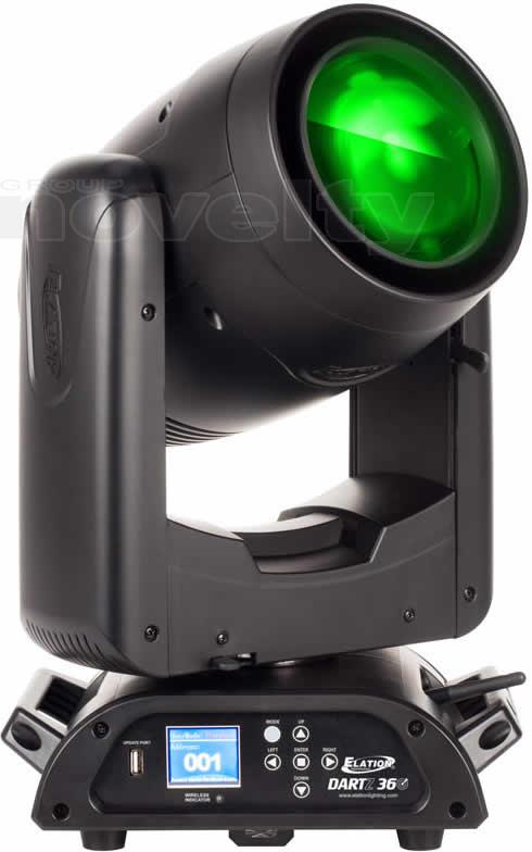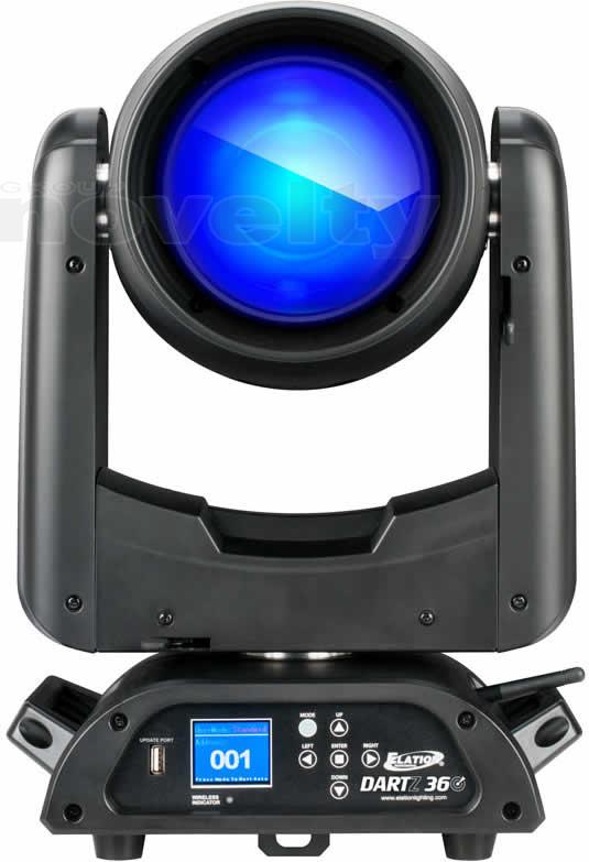 The DARTZ 360™ is a unique, compact, narrow beam luminaire featuring a new patent pending single source 50W RGB LED engine producing an impressive 3° aperture, amazing high output level, and smooth color-mixed effects that can be used in a variety of applications requiring no minimum safe project distance as with typical discharge lamp beam fixtures, fast and precise 16-bit continuous 360° pan and tilt rotation, 14 static-stamped metal gobos, 6-facet linear and 8-facet independent rotating prisms, 0-100% linear frost filter for wash effects, high speed electronic shutter and strobe, electronic dimming and variable dimming curve modes, adjustable LED refresh rate and gamma brightness for flicker free operation for TV and FILM, DMX, RDM (Remote Device Management), Kling-Net, Art-NET, and sACN protocol support, Elation’s E-FLY™ internal wireless DMX transceiver, 5pin XLR, RJ45 etherCON, and powerCON TRUE1 in/out connections, full color 180° reversible menu display with multi-button control panel, battery backup for display power, and a multi-voltage universal auto switching power supply (100-240v).