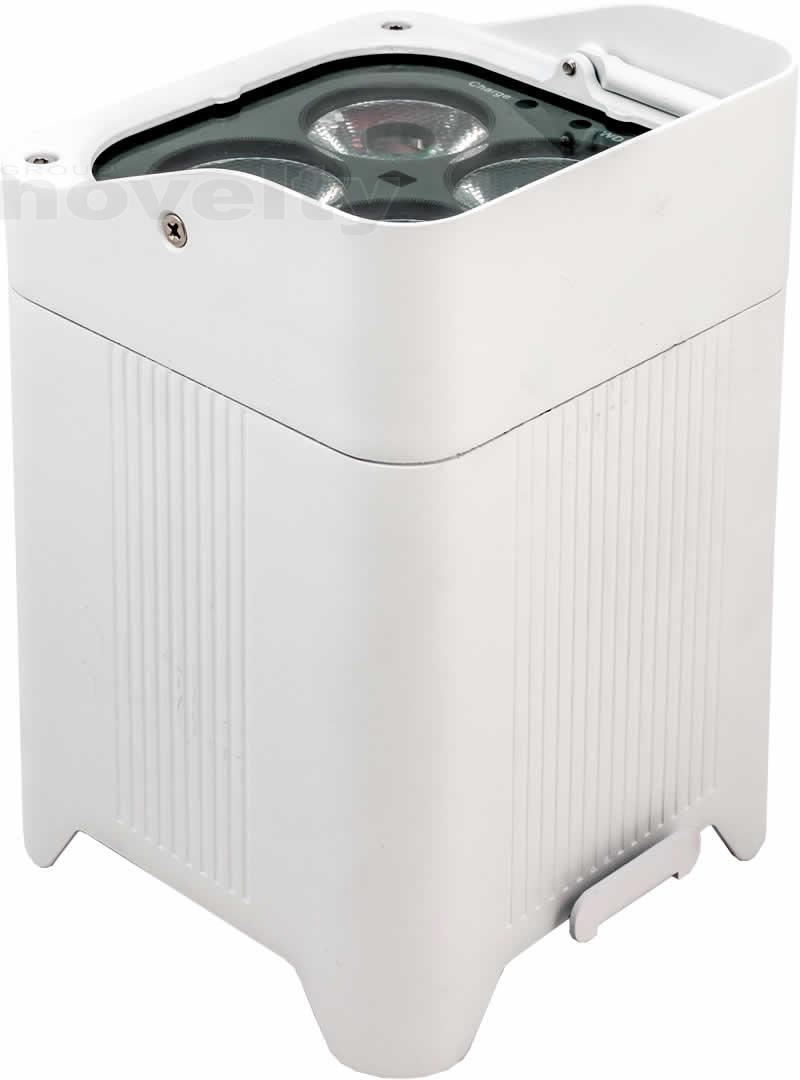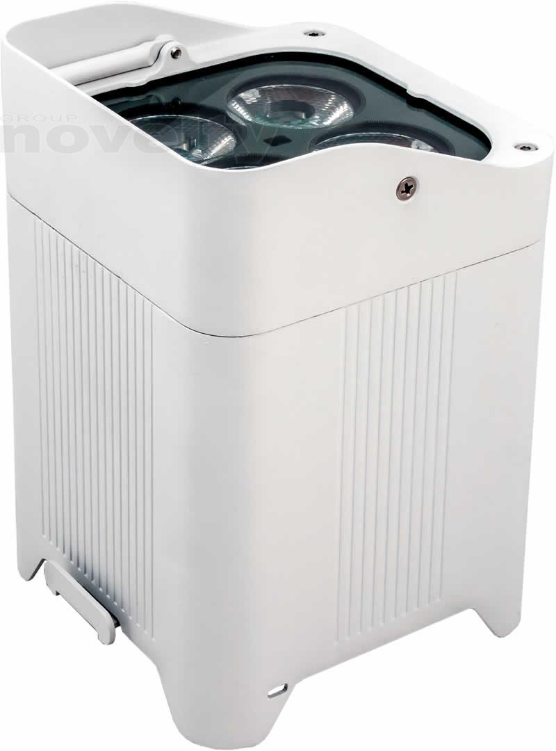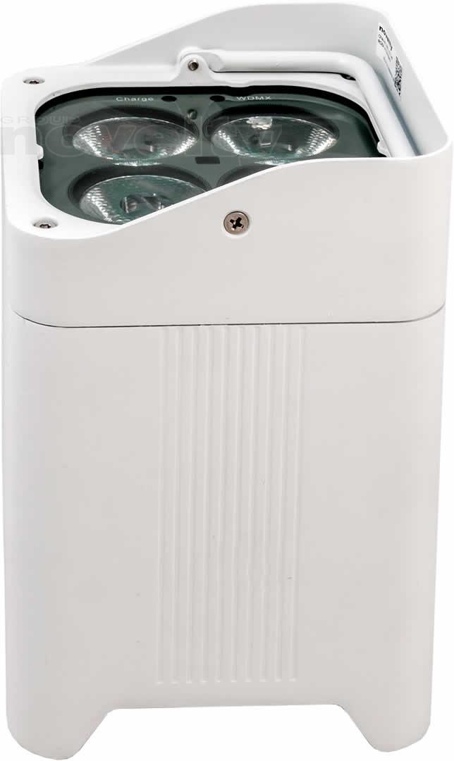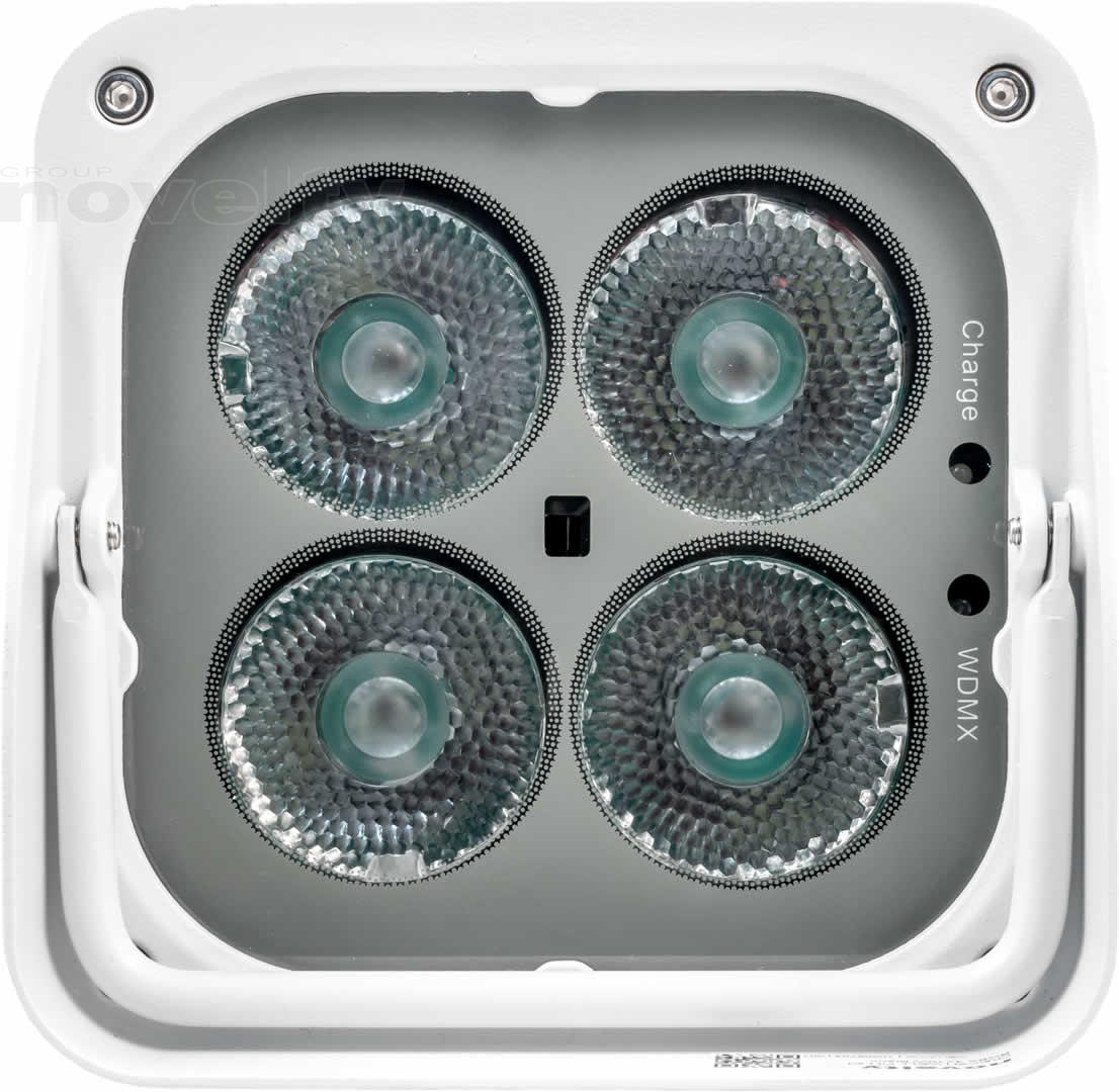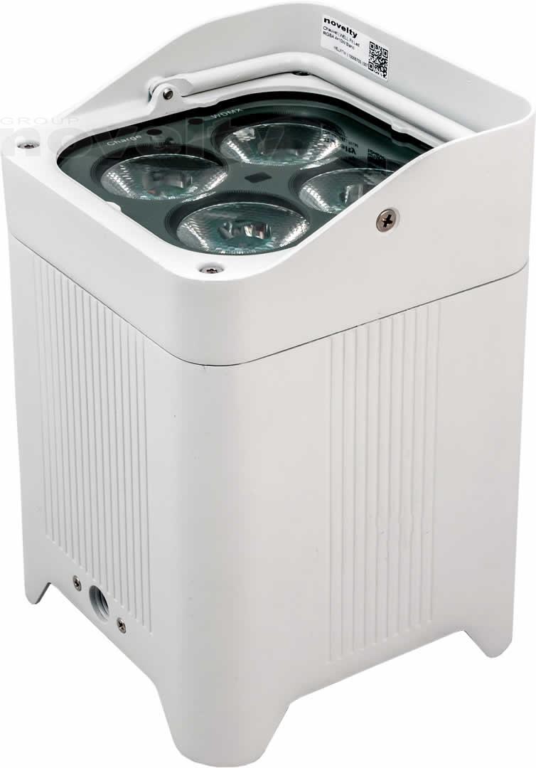 - A completely wireless IP65 rated battery powered up-light with four high powered quad colored RGBW LEDs that is controlled by W-DMX or IR remote.