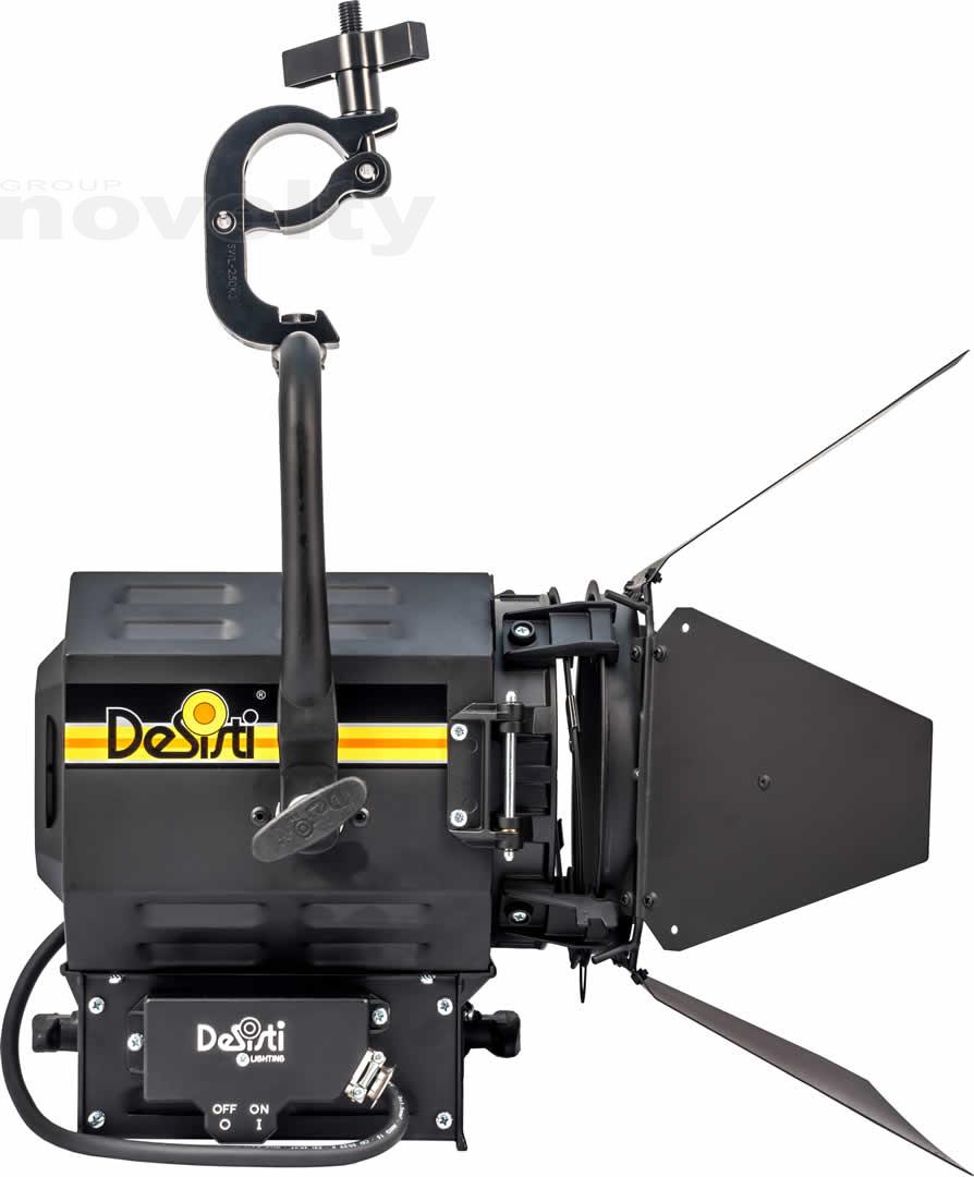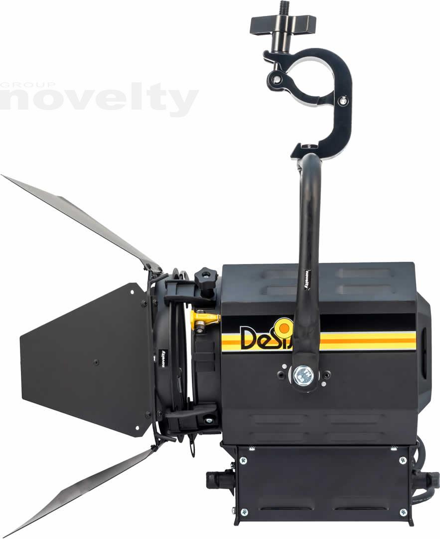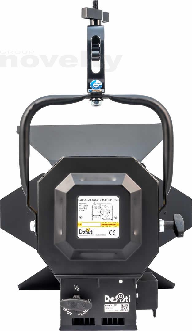 - The unit is equipped with a hinged lens door with wire-guard for easy access to the lamp, it includes accessory holding brackets, which can be positioned in two different arrangements (vertical-horizontal or diagonal). One of the 4 brackets has a locking knob and is spring loaded, it can be locked to either safely hold barndoor, color frame and scrims or to be rotated 90° and locked in an open position for fast accessories changes. A double safety accessory bracket with spring loaded catch is available on request to be assembled opposite to the locking knob.