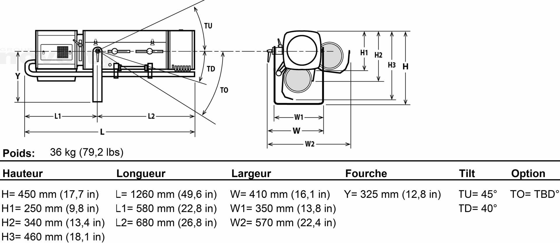 - Dimensions unitaires : 1260 x 450 x 410 mm (Poursuite sans pied)
