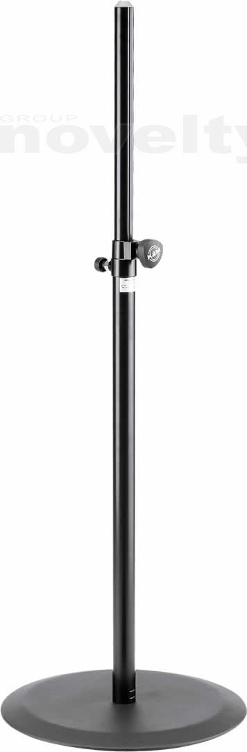 A decorative space saving speaker stand. The heavy cast iron plate with a relatively small diameter requires little space. The tried-and-tested spring-loaded bolt with locking screw makes height adjustment easy and safe. The stand has a maximum pull-out height of 1800 mm and is suitable for speakers with a maximum weight of 20 kg. The integrated mounting aid simplifies mounting the loud speaker cabinets.- Base diameter : 450 mm