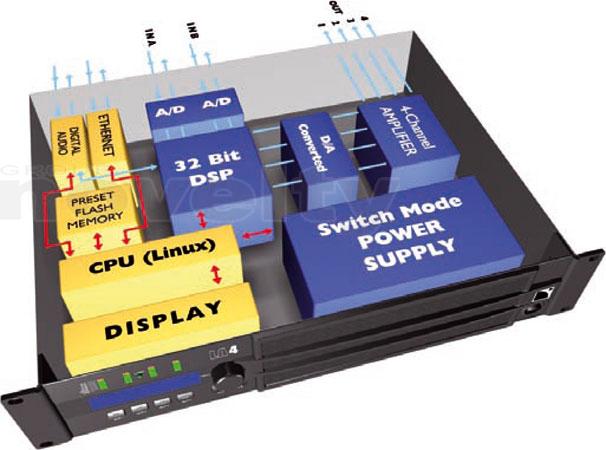 - 4 canaux d'amplification à haut rendement sur 2 entrées.