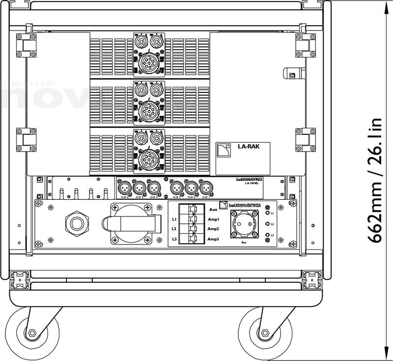 Le L-ACOUSTICS® LA-RAK est un rack 9U dans lequel sont montés trois contrôleurs amplifiés LA8, ainsi que trois panneaux de distribution : le LA-POWER pour l’alimentation, le LA-PANEL pour les signaux analogiques et le réseau, et le LA-PANEL AES3 pour les signaux audionumériques.