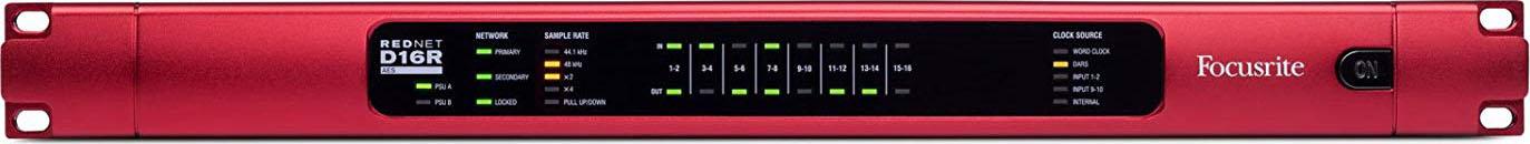 La Focusrite RedNet D16R est une interface 1U pour rack 19 pouces dotée de 16 canaux AES/EBU vers et depuis un réseau audio Dante, ce qui est parfait comme passerelle entre consoles numériques, amplificateurs de puissance ou tout autre équipement audio AES3 et un réseau Dante. Les deux connecteurs Ethernet (principal et secondaire) de la face arrière assurent une fiabilité maximale du réseau avec une bascule transparente sur un réseau de secours dans le cas peu probable d'une panne de réseau. Ces ports peuvent également servir à brancher en cascade des unités supplémentaires cas de fonctionnement en mode commuté.- Sample Rate Range