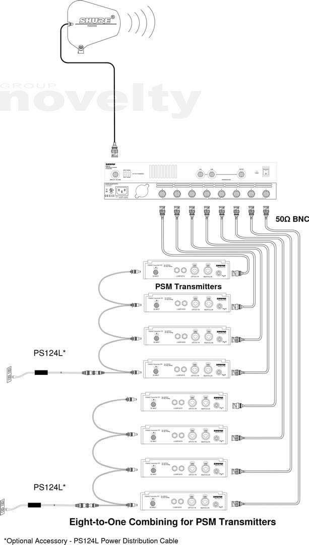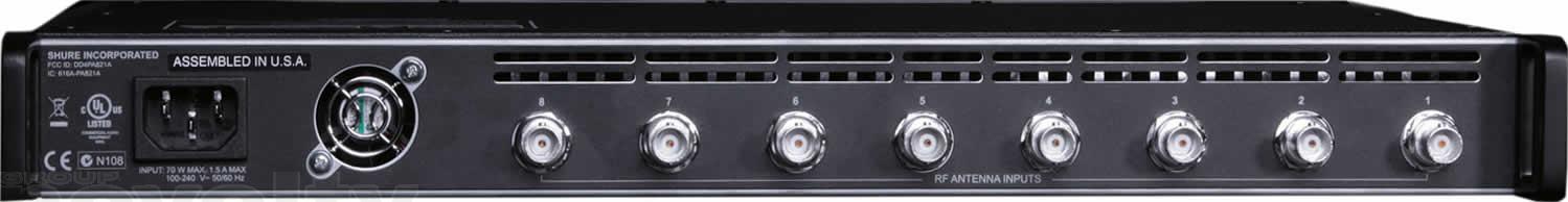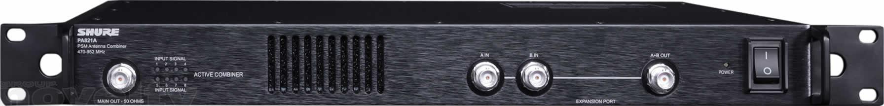 Le PA821A est compatible avec les systèmes suivants in-Ear sans fil de Shure: PSM 400, PSM 600, PSM 700, PSM 900 et 1000 PSM. Le PA821A peut également être utilisé avec d'autres émetteurs in-ear et / ou combineurs d'antennes avec combineur intégré passif avec deux entrées et une sortie.