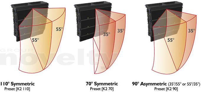 Une ligne source K2 profite des caractéristiques propres aux lignes sources WST® à courbure variable. Les angles inter-élément peuvent être réglés avec une précision inégalée, jusqu’à un généreux 10°, permettant l’optimisation de la couverture verticale avec une répartition homogène du SPL sur l’audience. Horizontalement, la couverture du K2 peut être ajustée pour correspondre précisément à un secteur de l’audience ou à une géométrie de salle. Quatre réglages sont possibles : deux symétriques (70° ou 110°) et deux asymétriques (90° en 35°/55° ou 55°/35°).