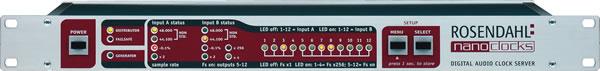 Nanoclocks is a word clock distributor with integrated audio master clock generator, dual inputs with frequency status indicators and programmable output matrix - a flexible tool for all extensive digital audio installations. The unit provides two transformer isolated word clock inputs and 12 word clock outputs to receive and distribute word clock signals over long distances. Ground potential variations, similar to earthloop induced hum in analog audio, can cause jitter in clock signals, a transformer isolated input eliminates this effect. In operation mode DISTRIBUTOR the two inputs A and B can be routed individually to each of the 12 outputs. Ten LEDs on the front panel indicate the sample rate of the incoming signals. Input B also accepts Fs x256 signals (also known as super clock). GENERATOR mode changes the unit into a ultra low jitter audio master clock generator with 12 programmable outputs. Supported sample rates are 44.1, 48, 88.2, 96, 176.4 and 192 kHz as well as the respective super clocks (Fs x256). FAILSAFE mode is a broadcast application, which monitors the two input signals and performs an automatic switch over of all 12 outputs if the primary word clock signal fails.