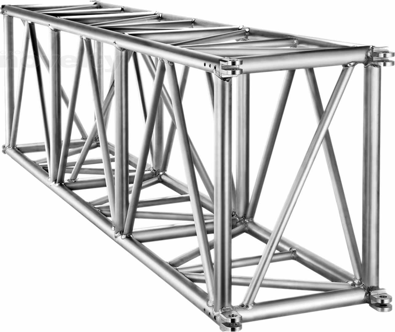 Rectangular section High Load aluminium truss with 76x52 cm long sides. It is diagonalized on all faces and is provided with steel fork connections. It ensures high load capacity on medium-long spans thanks to the design of its main components.