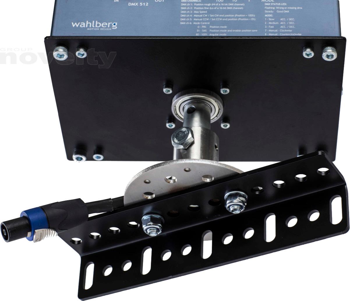 The DMX Rotator with power outlet contains 4 conductors emerging from the shaft. This way it is possible to power electrical equipment during rotation as well as controlling the equipment being rotated.
