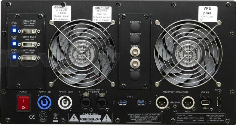 - Output connectors : 3 x DVI, 2 x XLR 3pin Sound (balanced), 2 x etherCON, 2 x USB, 1 x eSATA, 1 x PowerCON out