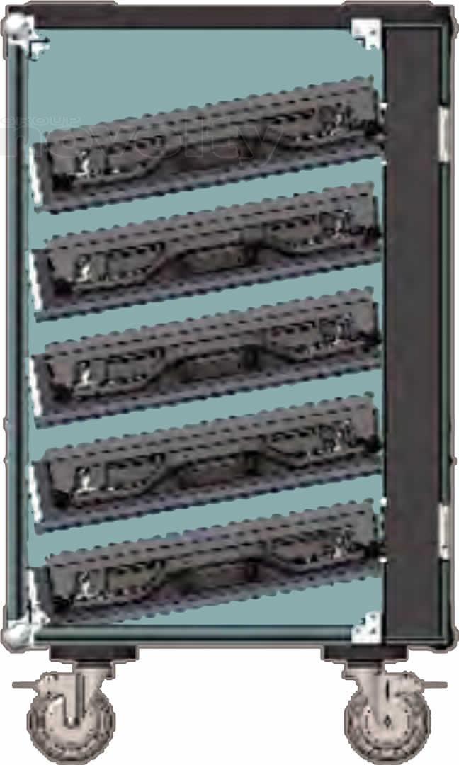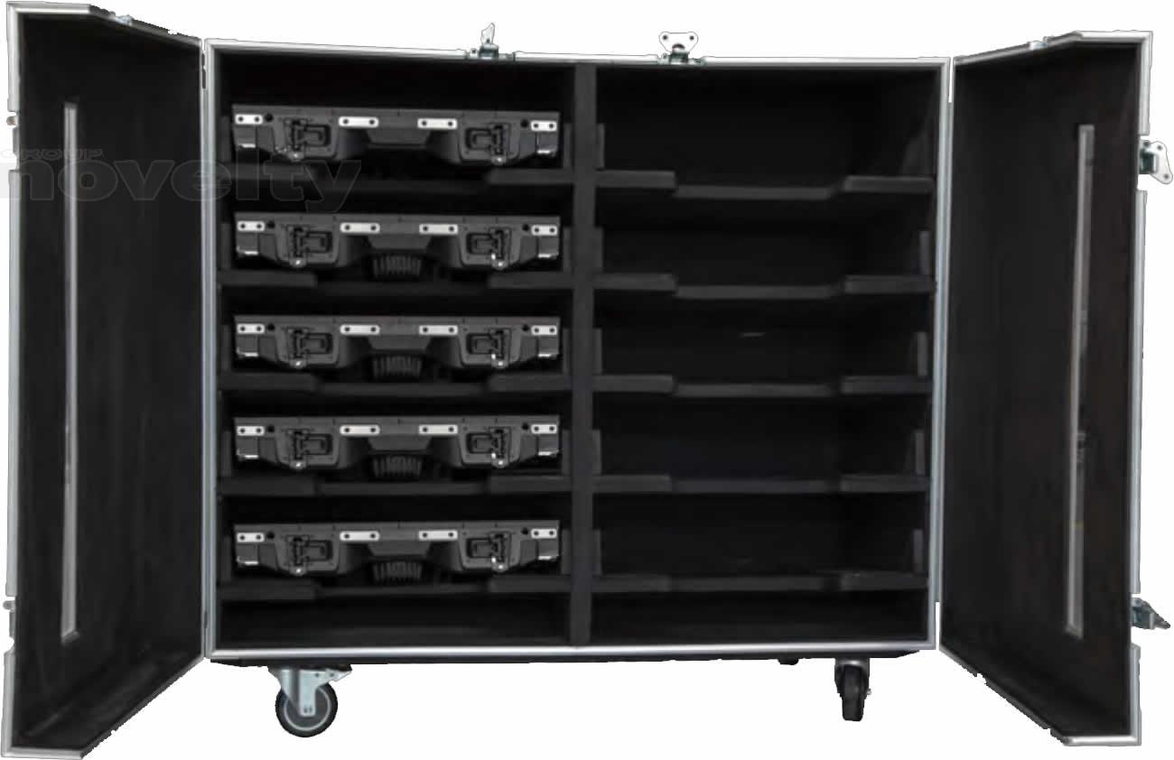 10 panels per case 5 panel high design LED panels stored horizontally to prevent SMD damage. Flight cases are optimised to fit in vehicles for low cost transport. Fully stackable to save space.