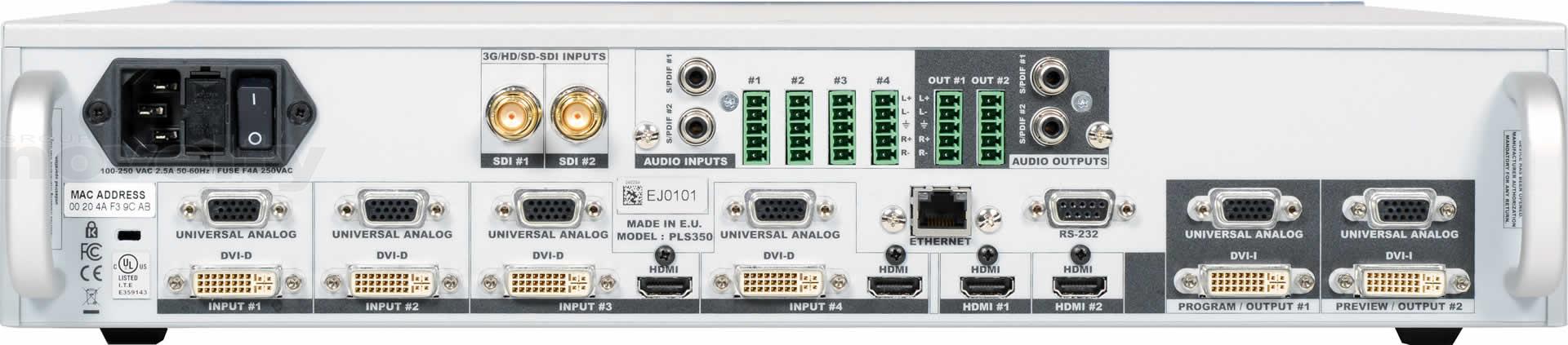- 14 connecteurs d’entrée disponibles (4 x DVI-D, 4 x HDMI, 4 x universels analogiques & 2 x 3G/ HD/SD-SDI)?Formats informatiques jusqu’à 2K