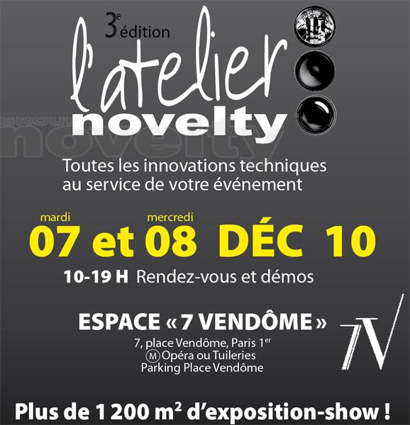 Pour la troisième année consécutive, le Groupe Novelty et ses marques (Novelty, Interpel, JLT Services, VPS et StageCraft Company) organisent L'Atelier Novelty, leur exposition-show les 7 et 8 décembre 2010. Après les succès du Musée de l'Homme en 2008 et de son nouveau dépôt de Longjumeau en 2009, le groupe spécialiste de la prestation technique événementielle investit cette année la très chic Place Vendôme (Paris 1er) et l'Espace "7 Vendôme", un nouveau lieu qui a déjà accueilli plusieurs défilés et soirées prestigieuses. "Le quartier et le lieu correspondent parfaitement à ce que nous voulons montrer : une technique événementielle pointue, design et harmonieuse, qui met en valeur le message de l'annonceur et qui inclut les matériels, les compétences et les services les mieux adaptés" confie Olivier Hagneré, Directeur général délégué du Groupe Novelty.