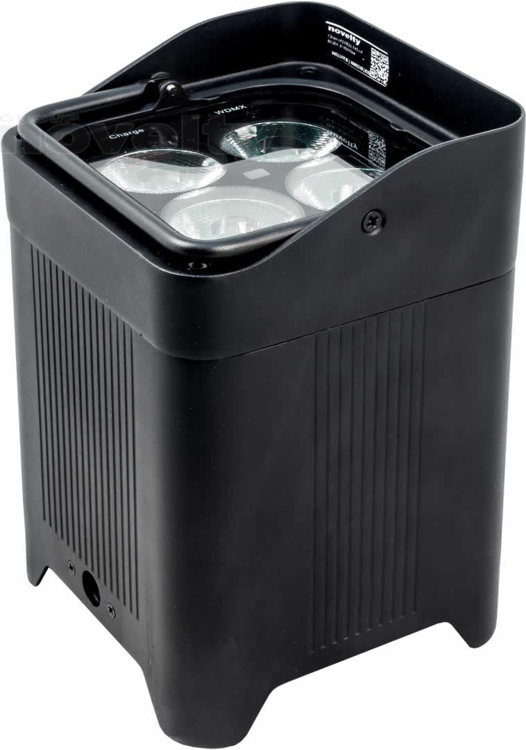 - A completely wireless IP65 rated battery powered up-light with four high powered quad colored RGBW LEDs that is controlled by W-DMX or IR remote.