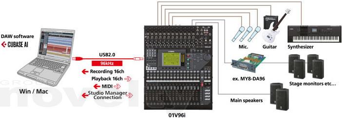 Pour faciliter les enregistrements multipistes en configuration scénique, elle est équipée d'une liaison USB2 permet à la 01V96i d'accéder facilement à 16 entrées et 16 sorties audio à 96 kHz via un ordinateur. La console est compatible avec tous les logiciels compatibles ASIO et Core Audio. Livrée avec la dernière version du séquenceur Cubase AI, elle offre ainsi de nombreuses possibilités d'enregistrement, d'édition et de mixage. Bien entendu, le routage des signaux audio peut également se faire via une carte YAMAHA mini-YGDAI (MY) ou les ports ADAT intégrés.